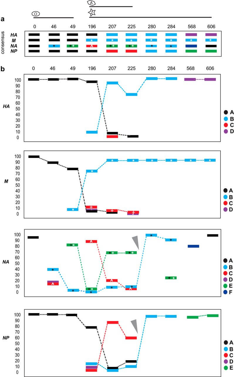 Using single-molecule sequencing, the mutational spectrum of an H3N2 influenza A virus population documented the complex dynamics underlying the evolution of antiviral resistance. The figure shows a schematic representation of lineage dynamics for Influenza A segments HA, M, NA, and NP, and consensus (a) and haplotype (b) frequencies across time points2.