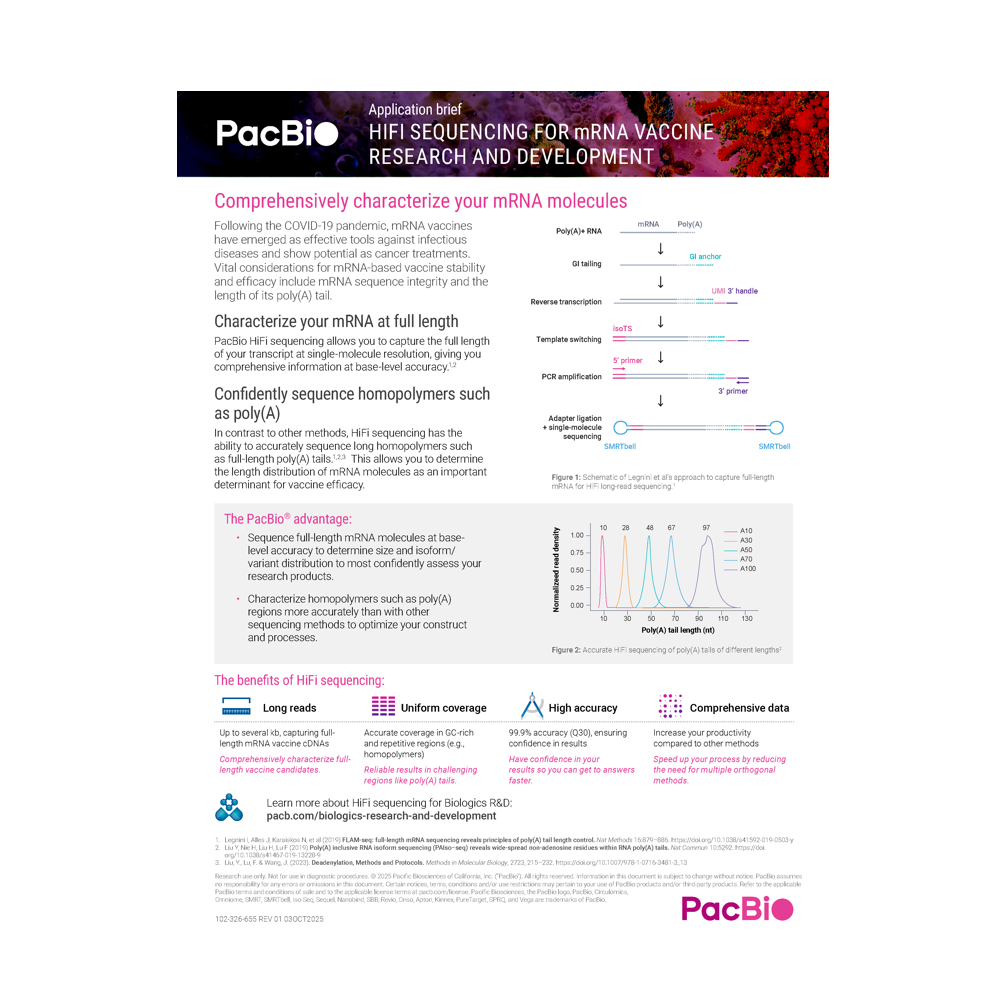 In contrast to other methods, HiFI sequencing has the ability to accurately sequence long homopolymers such as full-length poly(A) tails. This allows you to determine the length distribution of mRNA molecules as an important determinant for vaccine efficacy.
