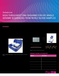 September 21, 2023 Technical-note-High-throughput-DNA-shearing-for-HiFi-whole-genome-sequencing-from-whole-blood-samples Subscribe for blog updates: Search for: Filter by topic Bioinformatics Gene therapy + editing AAV Metagenomics Sequencing methods Whole genome sequencing Targeted sequencing RNA sequencing Epigenetics Liquid biopsy HiFi difference Featured Computational tools Haplotype Genomic sequencing Repeat expansions Multiomics Biopharma Customer success stories Powered by PacBio People First Human genetics research Corporate news General Events + conferences Plant + animal biology Products, procedures + protocols Infectious disease research Microbial sequencing methods Sequencing 101 Agrigenomics Pharmacogenomics Rare disease Microbiome Data analysis Neurogenomics Cancer research Biodiversity Immunogenomics + HLA Public health + surveillance Sample + library preparation